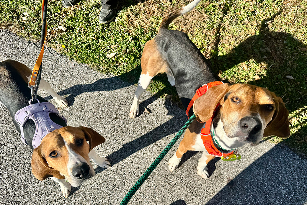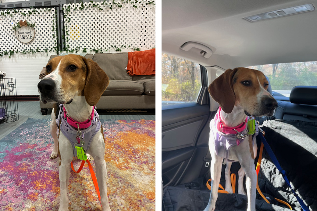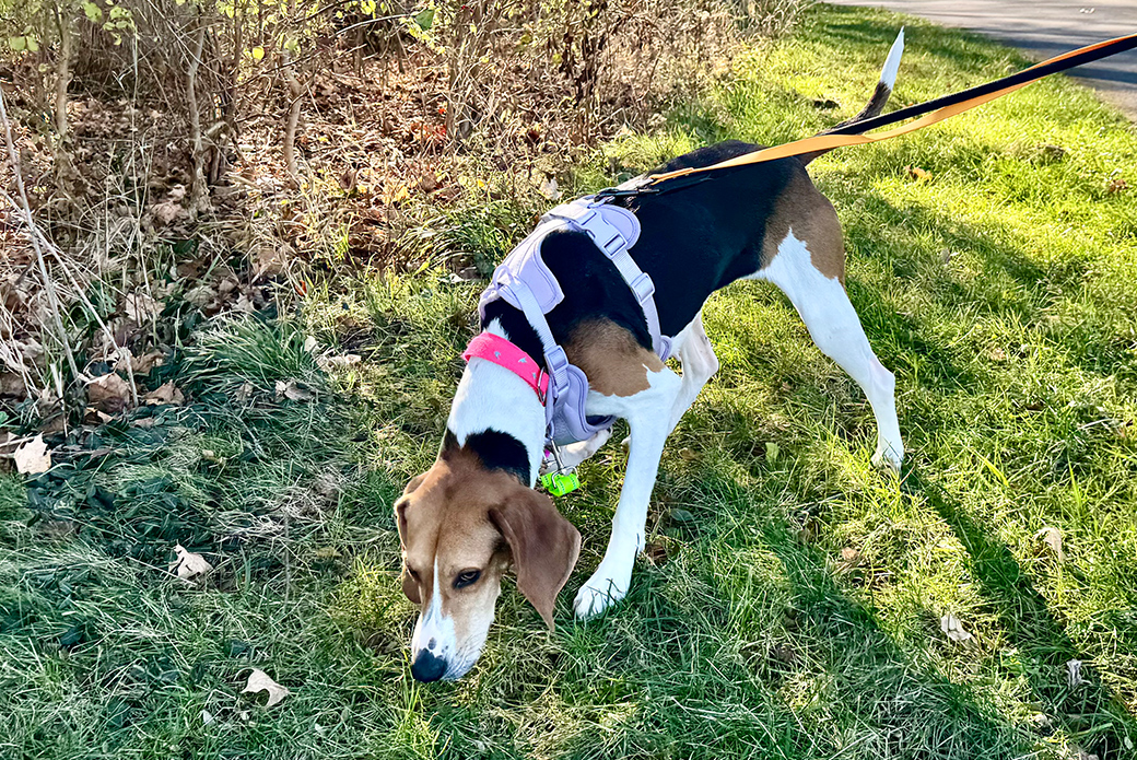 On leash, she can pull a bit (true to her hound roots), and she may pause or balk when something feels unfamiliar. Giving her a moment to look around — or having a calm dog to follow — helps her settle in and continue on her walk.