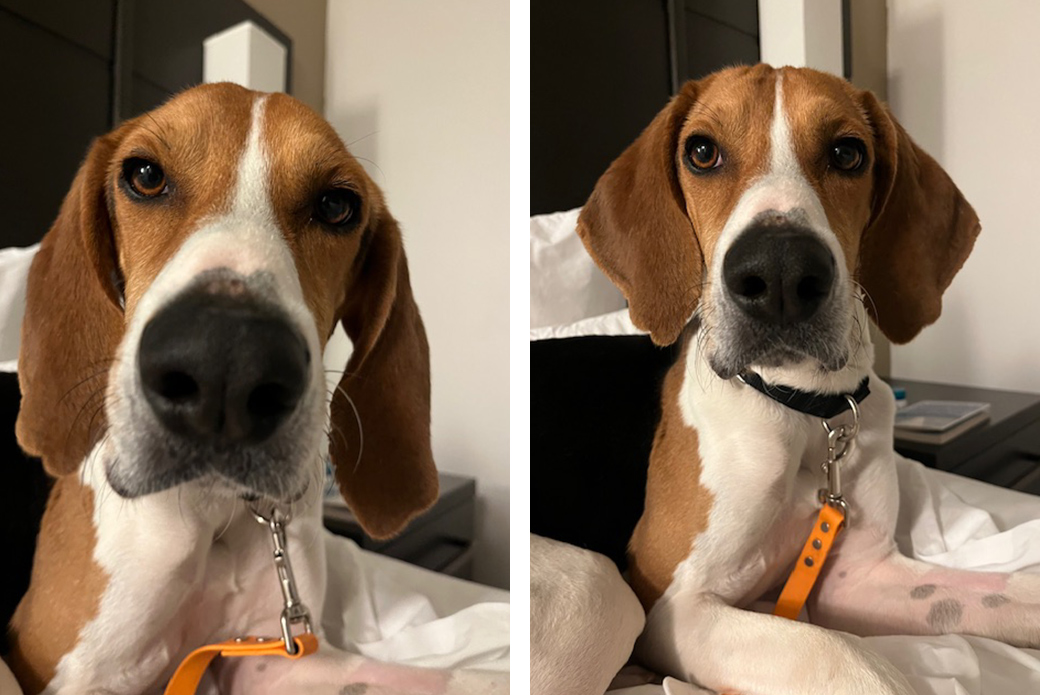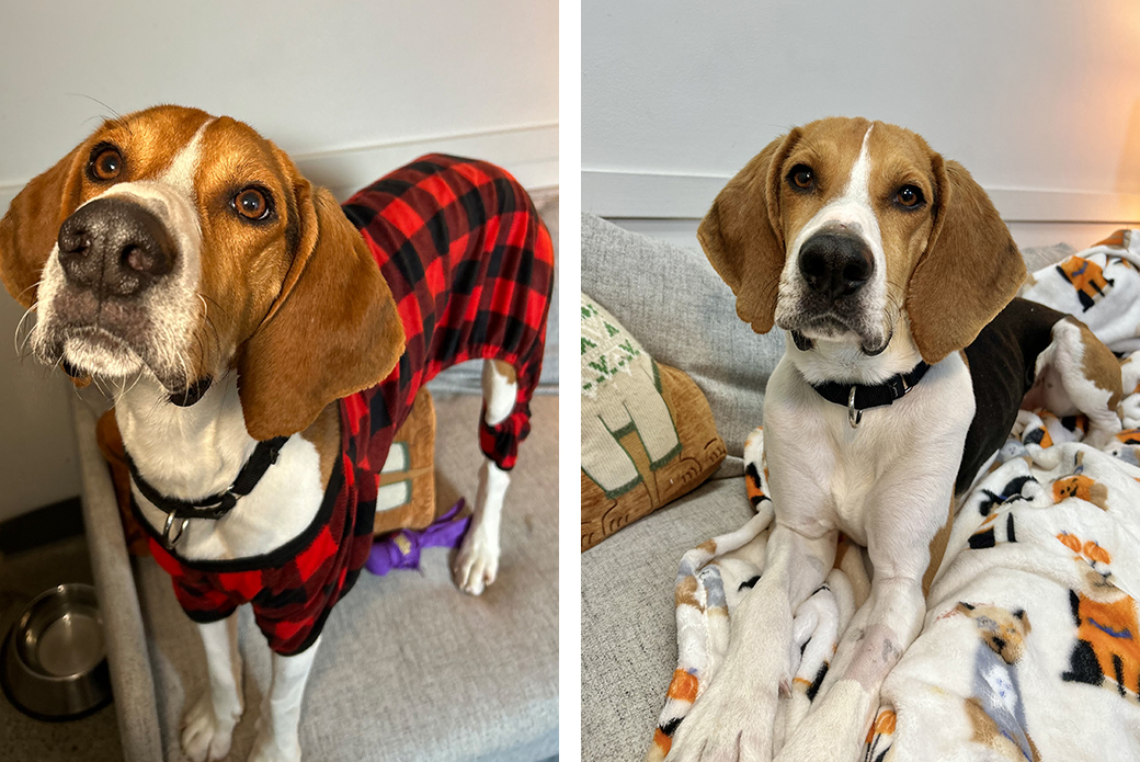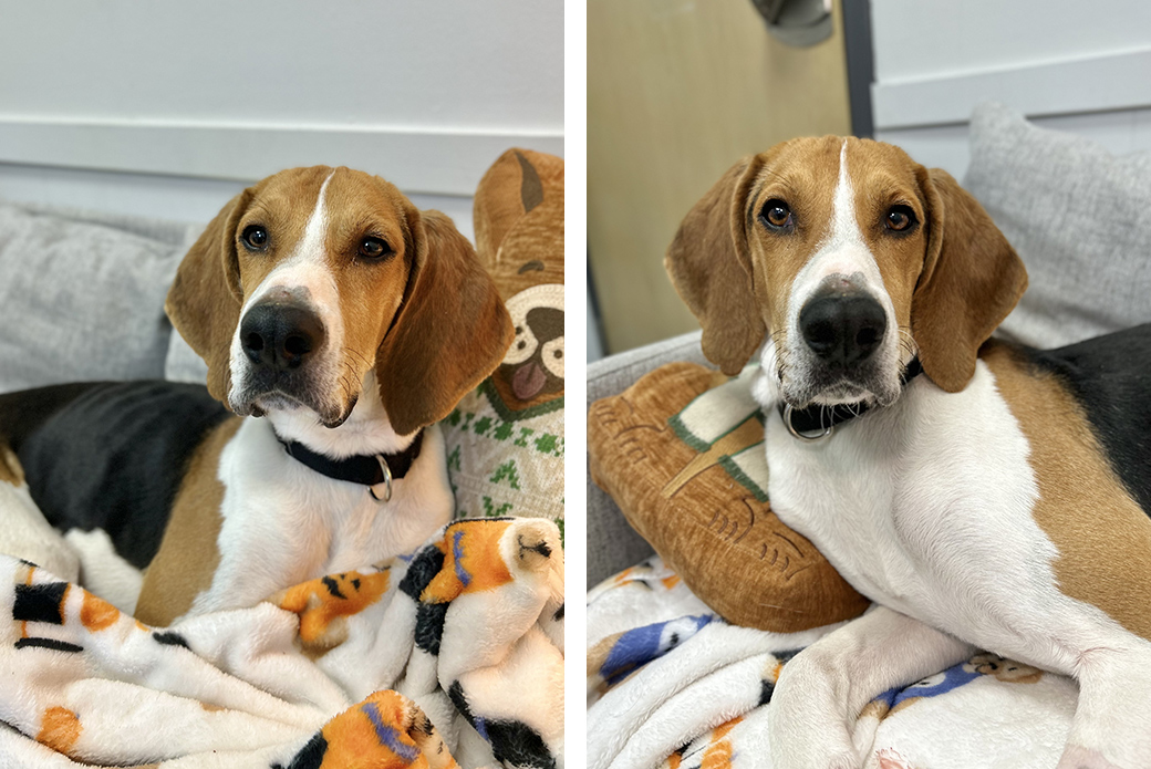 Hastings loves his walks and really enjoys following his nose to explore new scents — it’s his favorite hound hobby! He has also shown signs of being housetrained and has been a perfect gentleman during sleepovers. Once he gets comfy, he settles right in, curling up for naps or snoozing the night away like a champ.