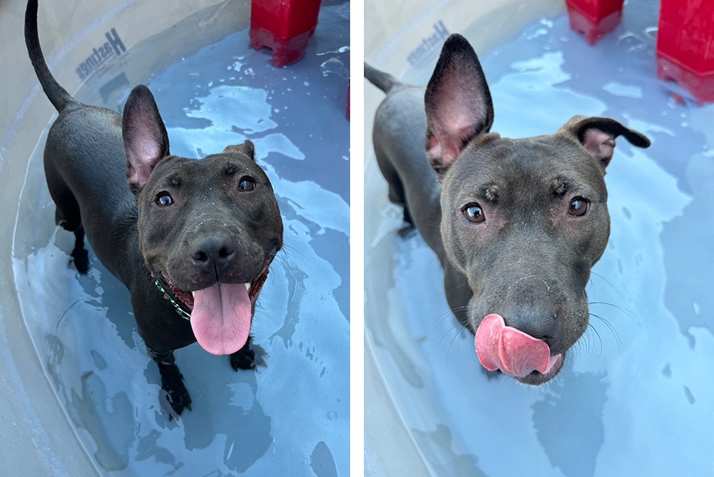 Truffle has also shown promising houseguest manners! When taken out regularly, she didn’t have a single accident, and we suspect she may already be housetrained. She can be a delicate eater, nibbling at her food, but she happily eats when she has her person nearby for comfort. At night, she transforms into a cuddlebug, snuggling close on the pillows and sleeping soundly by your side. And don’t forget her favorite hobby — splashing in the kiddie pool on sunny days! She’s truly a water-loving girl at heart.