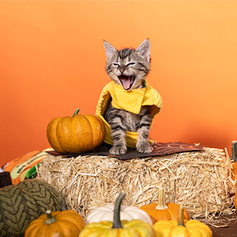When it comes to party decorations, a carved jack-o-lantern certainly is festive, pets can easily knock over a lit pumpkin and start a fire. Curious kittens are especially at risk of getting burned or singed by candle flame. Also be sure to keep any wires out of paw’s reach!